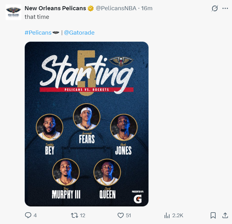 加時賽,史密斯中投命中,鵜鶘前場籃板墨菲補籃,亞當斯竟然不給杜蘭特球,KD繞了一圈只能出去了,阿門中投又鐵,貝三分命中踩線的兩分,火箭是連續的前場籃板二次進攻打鐵,杜蘭特還是沒有獲得出手機會,申京失誤奎因快攻暴扣,杜蘭特持球暴扣續命,貝單打申京命中,杜蘭特被三分犯規三罰全中,普爾兩罰全中,謝潑德兩個三分絕平不中,比賽完結。