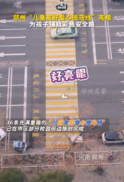 連日來,在鄭州惠濟區的幼兒園門前,護學志愿者有序引導學生通過繪有心形圖案的彩色斑馬線。“瀝青路面上,這些彩色線條的視覺警示效果非常突出,司機老遠就能注意到,會自覺提前減速。”一位志愿者受訪稱,斑馬線上印有“關愛兒童”等溫馨提示,以及“見鄭友好 童創未來”等充滿童趣的標語,讓孩子們更樂意自覺在斑馬線行走。