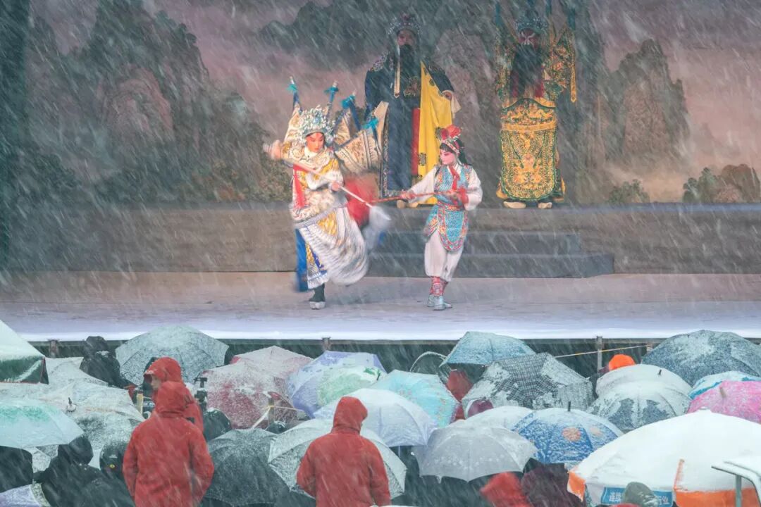 12月12日,河南洛陽市偃師區大口鎮西寨村,大雪紛飛,河南豫劇院青年團的演員仍在專注表演。觀眾撐著傘守在戲臺前——“戲沒停,咱咋能走?”