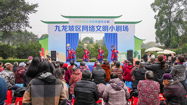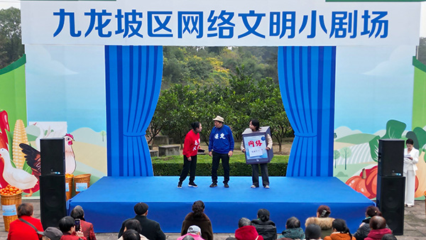 ??活動中,九龍坡區(qū)委網(wǎng)信辦原創(chuàng)編導(dǎo)的《手慢點》《看清楚》等8個網(wǎng)絡(luò)文明主題情景劇輪番上演。演員們用當(dāng)?shù)胤窖裕瑢ⅰ梆B(yǎng)老金騙局”“朋友圈謠言”“網(wǎng)絡(luò)暴力”等鮮活案例搬上舞臺。臺下,幾十位村民看得目不轉(zhuǎn)睛,不時爆發(fā)出笑聲或議論聲。