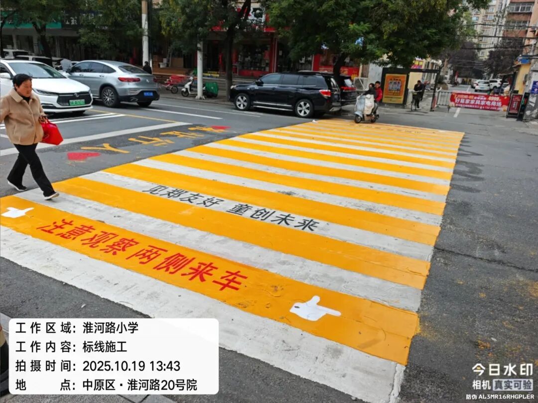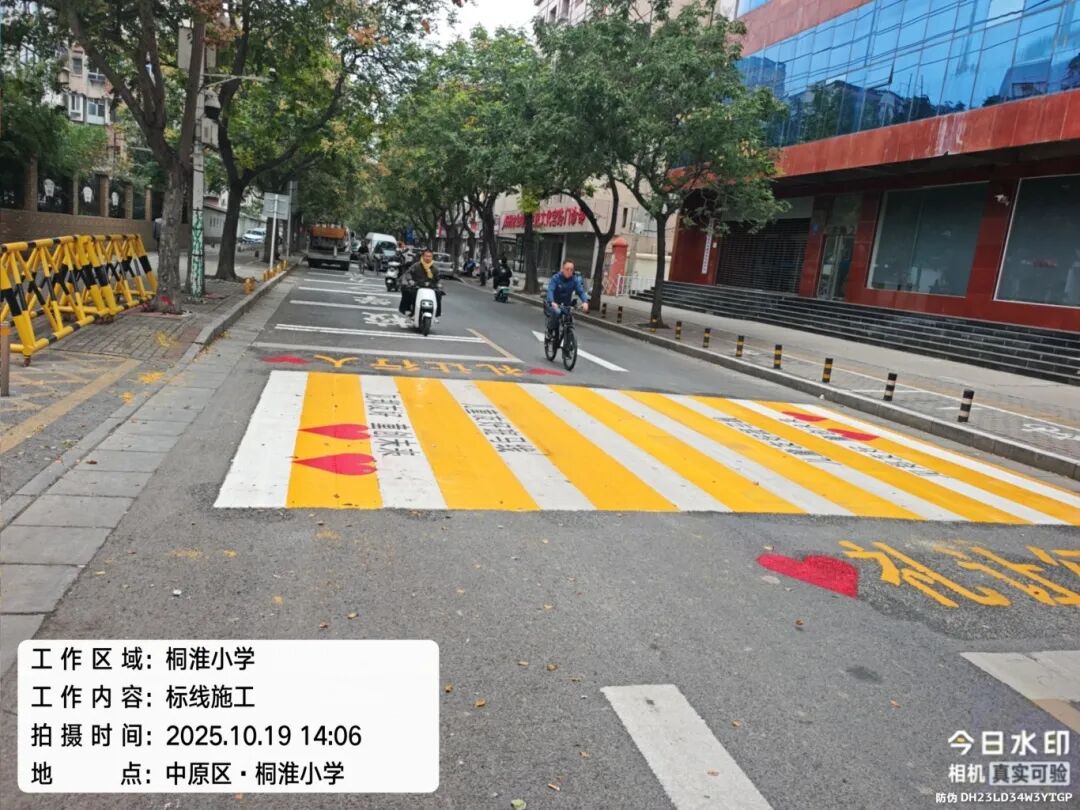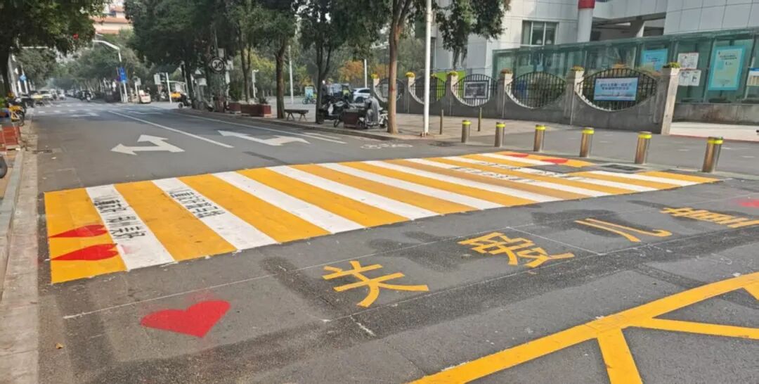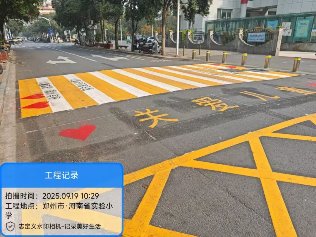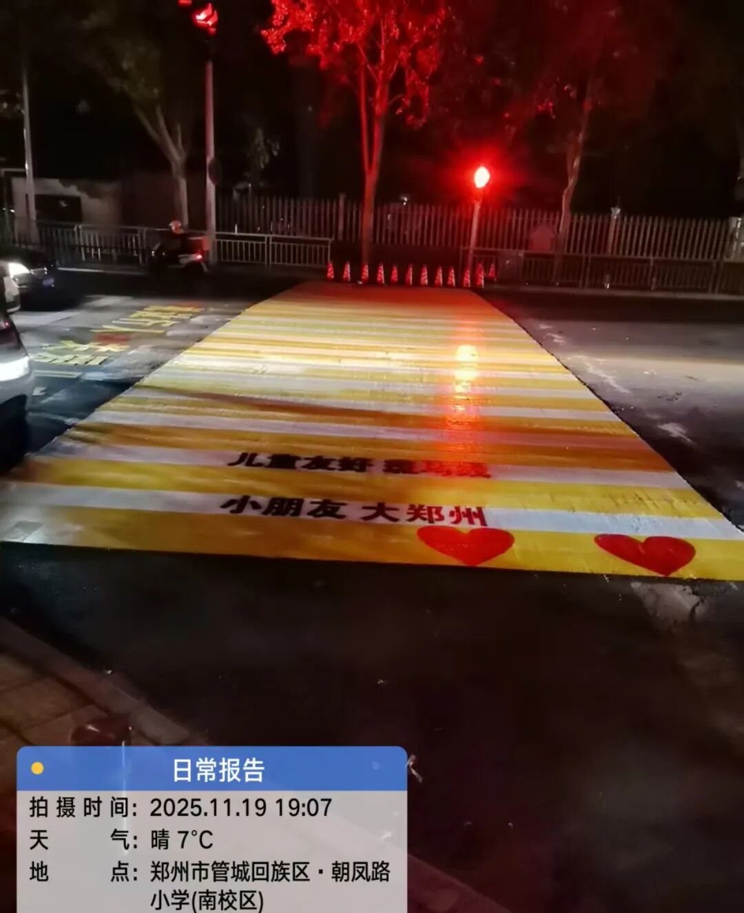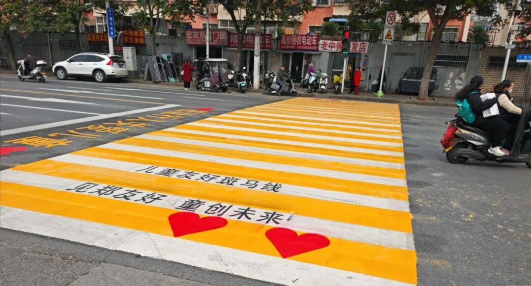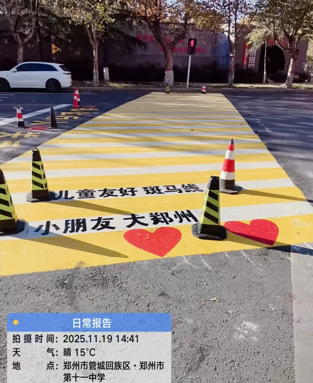 “兒童友好愛心斑馬線”是鄭州專為兒童設計的友好型過街通道。它精準回應了孩子們“視線低、易分心、反應慢”的出行特點,通過醒目的黃白色彩與童趣化設計,既能在遠處提醒車輛提前減速,也能吸引孩子主動走斑馬線,在潛移默化中建立安全意識,為他們的上學路鋪就一道看得見的安全彩虹。