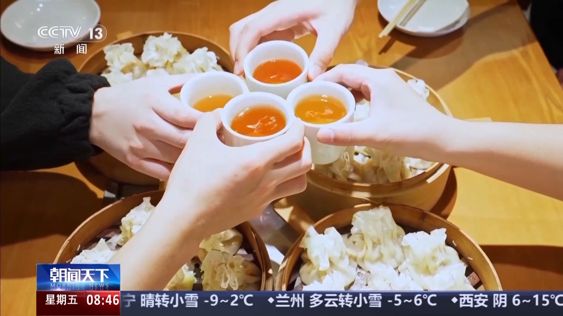 總臺記者 趙思雯:燒麥有蒸和煎兩種做法。吃燒麥就要配上醋和辣椒油,這個面皮看著很薄,但咬起來卻是筋道的,內餡保留著羊肉和大蔥的香味。再試試煎燒麥,底部這層酥脆的殼咬起來是“咯吱咯吱的”,因為混合了油香,整體的口味更加濃郁。而這一碗用羊骨與新鮮雜碎熬煮而成的羊雜湯,則是燒麥的絕佳搭配。撒上翠綠的香菜,淋一勺鮮亮的辣椒油,喝上一口,鮮、香、辣、暖層層遞進,瞬間驅散一身寒氣。