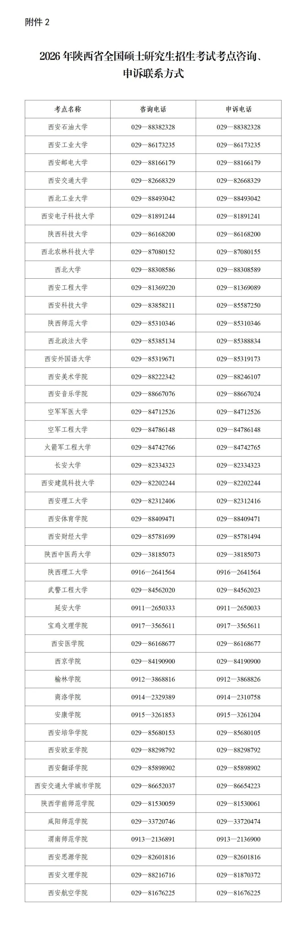 2.2026年陜西省全國碩士研究生招生考試考點咨詢、申訴聯系方式