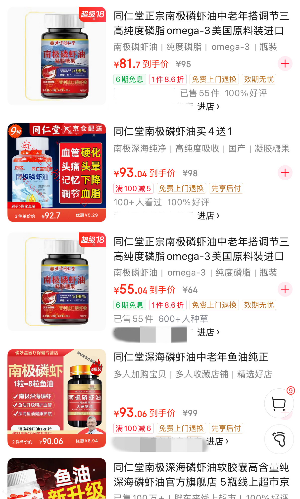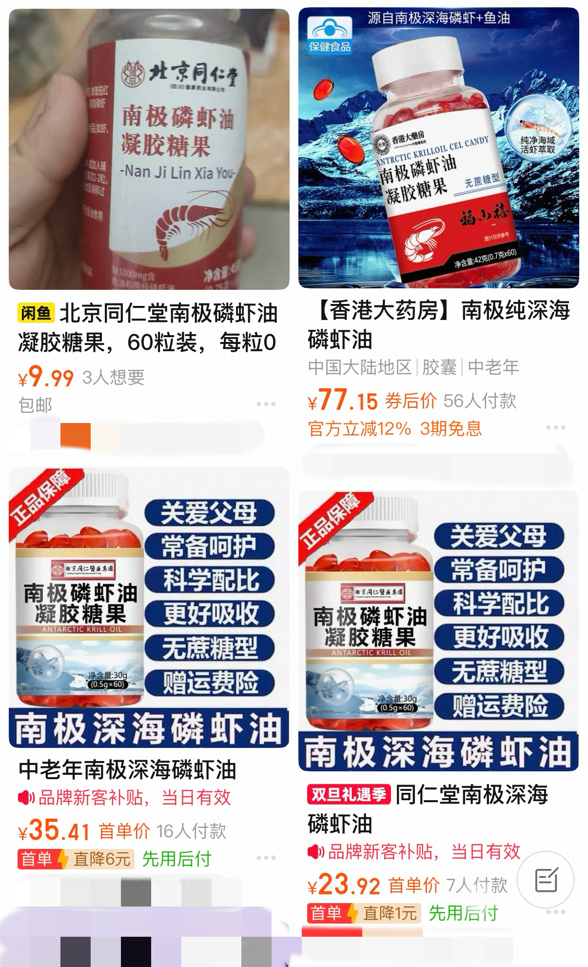 以“同仁堂南極磷蝦油”為關鍵詞搜索,能發(fā)現多種不同標簽的產品。圖片來源:網絡。