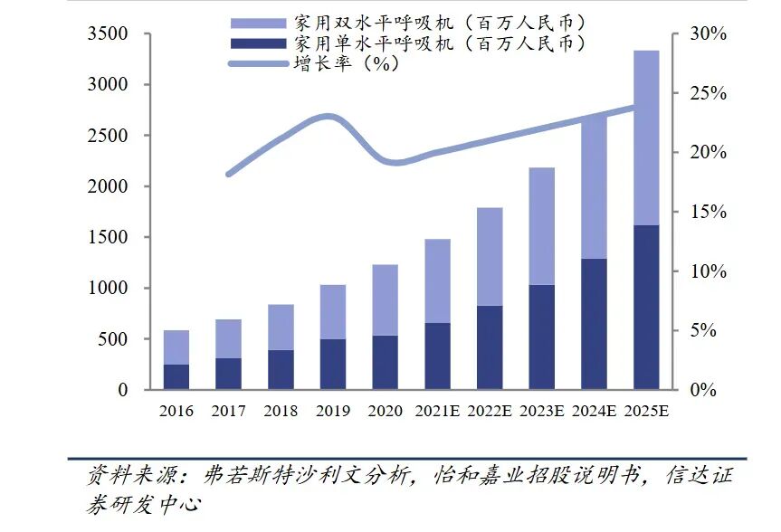 2016-2025E中國家用無創呼吸機市場規模及預測 來源:信達證券