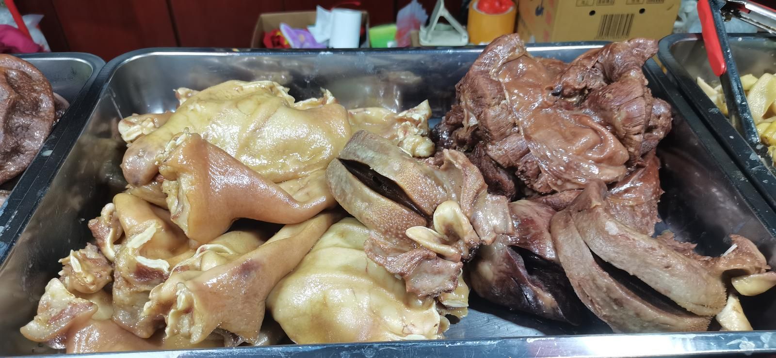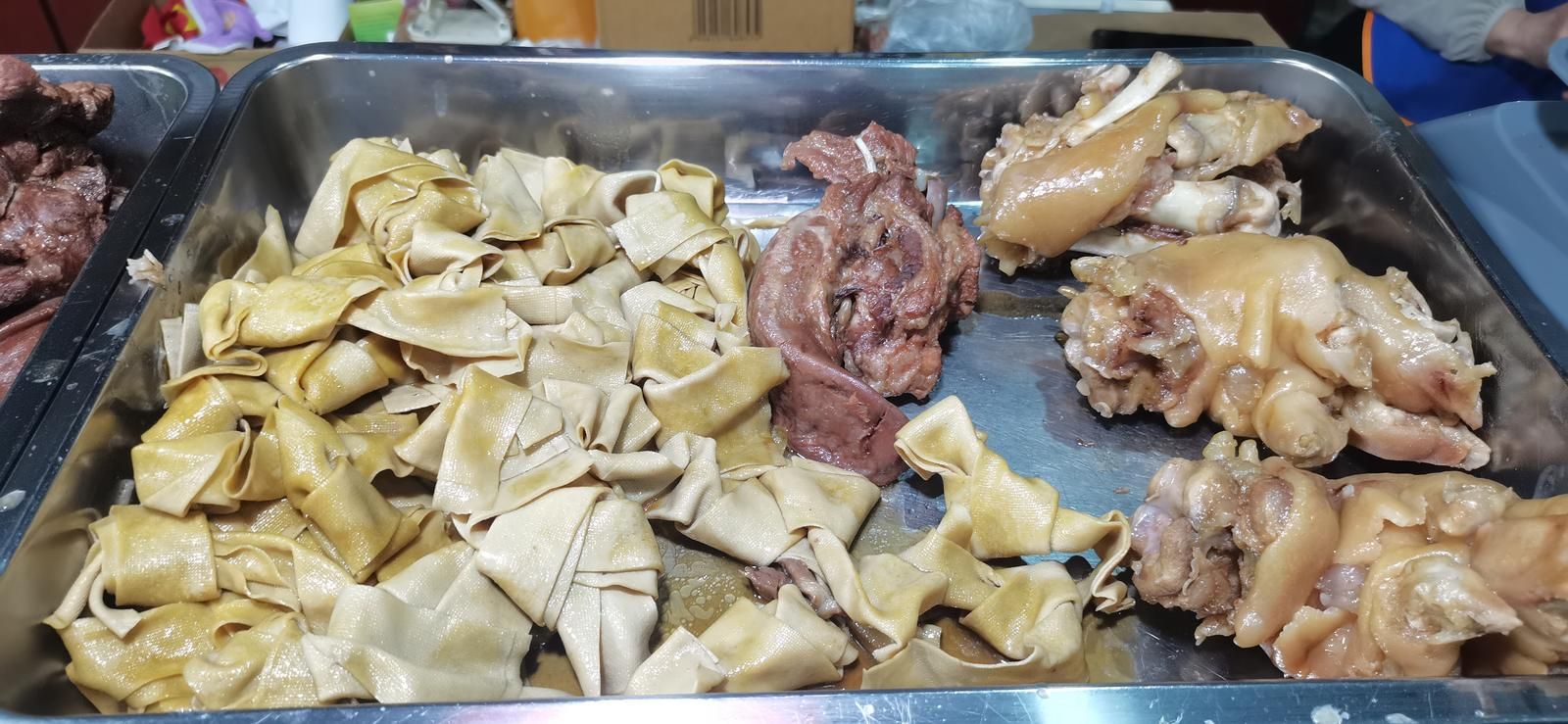凌晨三四點,趙煥超就要趕到屠宰場,挑選豬頭、豬蹄和豬下水?;貋碇笸拭⑶逑?、分割,忙完常常已是上午九點。緊接著便是下鍋鹵制。“鹽要隨肉量增減,鹵料包也要定時換,火候更是關鍵——豬蹄要久一點,耳朵不能太久……總結起來就是:鹽隨肉增,料按時換,火候是靈魂——蹄要糯,耳要脆?!睔q月教會他鹵鍋里的哲學。