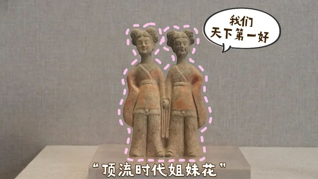 洛陽博物館的北魏彩繪陶牽手女傭,出土自洛陽市宜陽縣馬窯村楊機(jī)墓,與常見的陶俑不同,這件陶俑由兩人組成,姐倆頭梳雙髻,飾有花鈿,身著左衽寬袖紅色上衣,下著寬大喇叭形長褲,束腰帶,并肩站立,手牽著手,笑容溫婉、姿態(tài)親昵,被網(wǎng)友稱為“千年好閨蜜”。