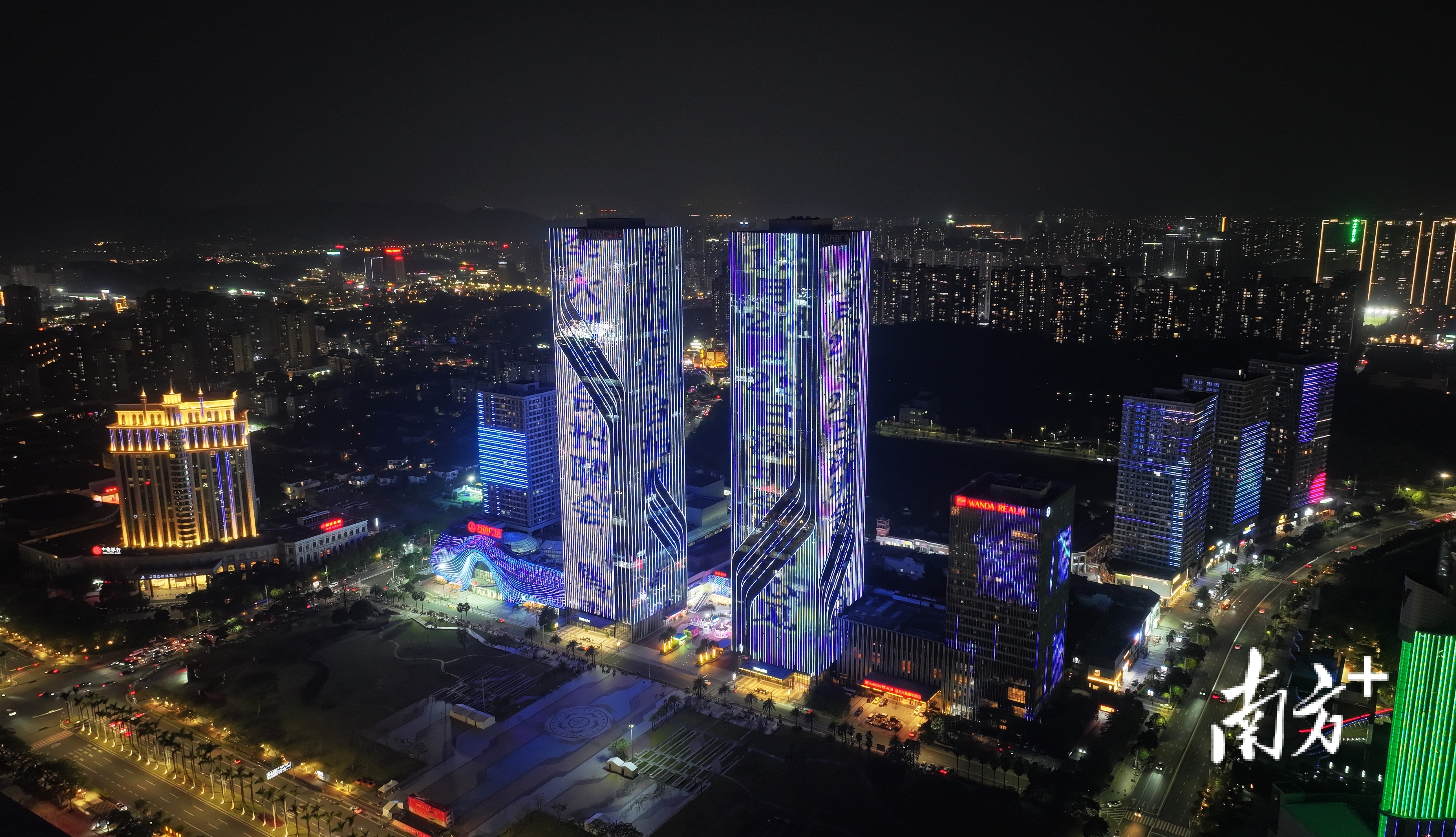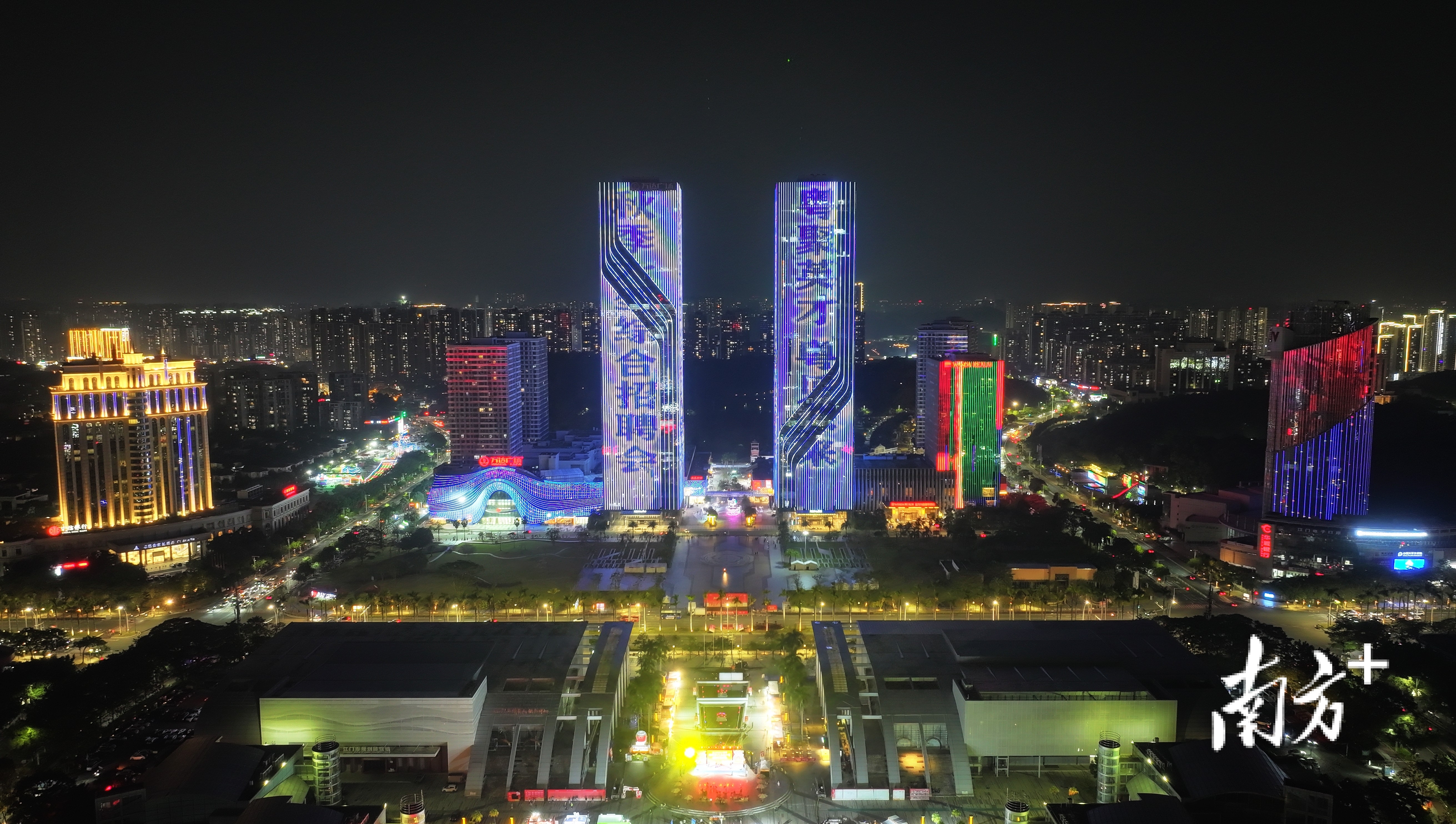 江門市中心城區地標建筑——萬達雙子塔燈光璀璨,為“百萬英才匯南粵”秋季大型綜合招聘會亮燈。