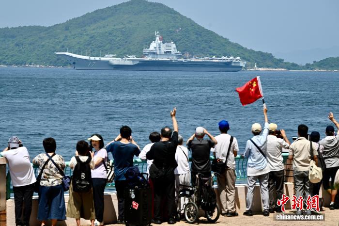 2025年7月7日,由中國人民解放軍海軍航空母艦山東艦,導彈驅逐艦延安艦、湛江艦及導彈護衛艦運城艦組成的航母編隊完成在香港的訪問活動,離開香港海域。圖為當天上午,香港民眾手持國旗在海怡半島海濱送別山東艦航母編隊。 中新社記者 李志華 攝
