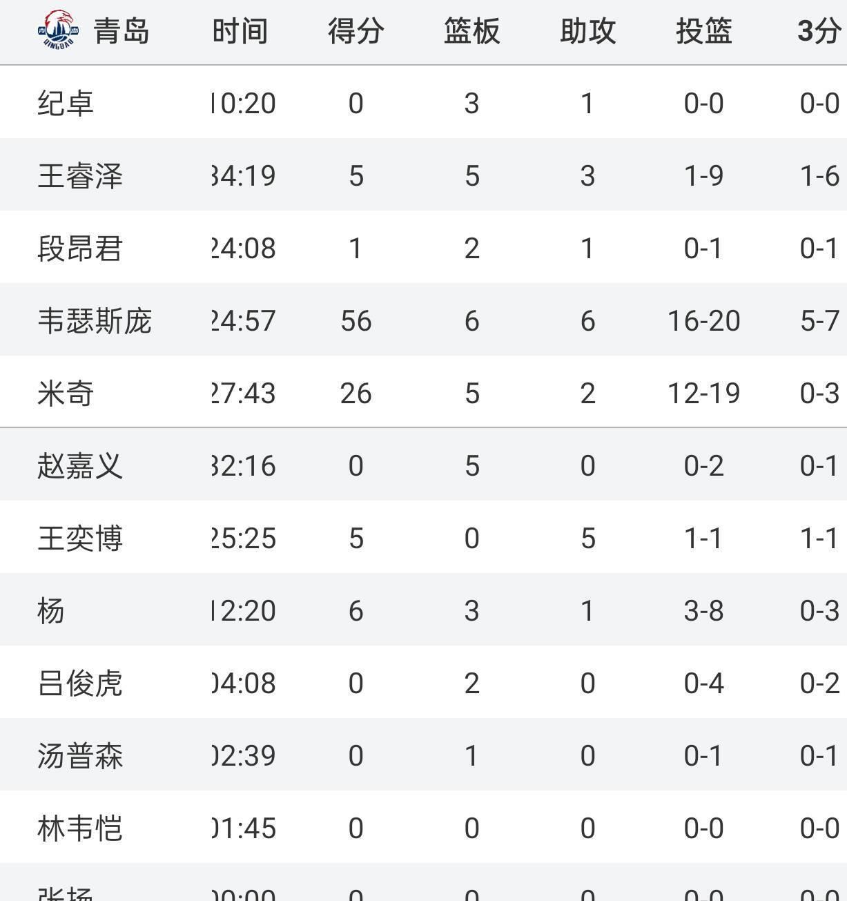 青島隊的外援韋瑟斯龐,24分鐘里20投16中,罰球20中19,狂攬56分6籃板6助攻。 全隊99分,他和另外兩個外援一起包辦了88分,而9個中國球員加起來,只得了11分。
