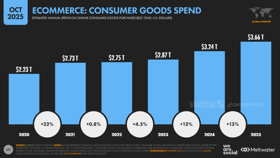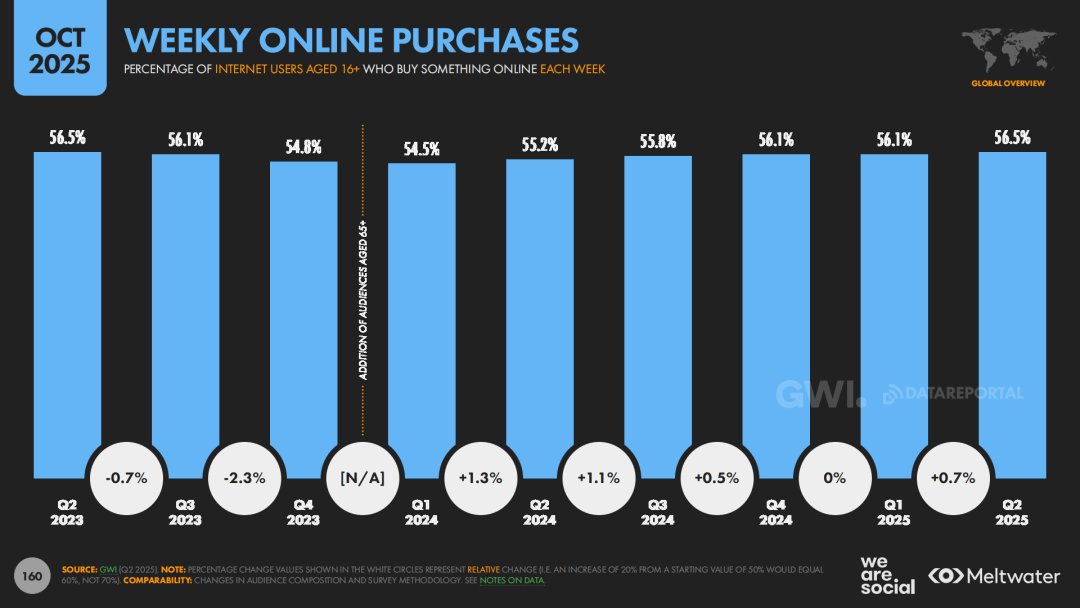 報告顯示,全球B2C電商規模已達約3.66萬億美元,近兩年年增長率約13%,每周進行網購的用戶占比達到56.5%,“線上購物”在許多國家已經從“替代方案”變成日常生活的“默認選項”。