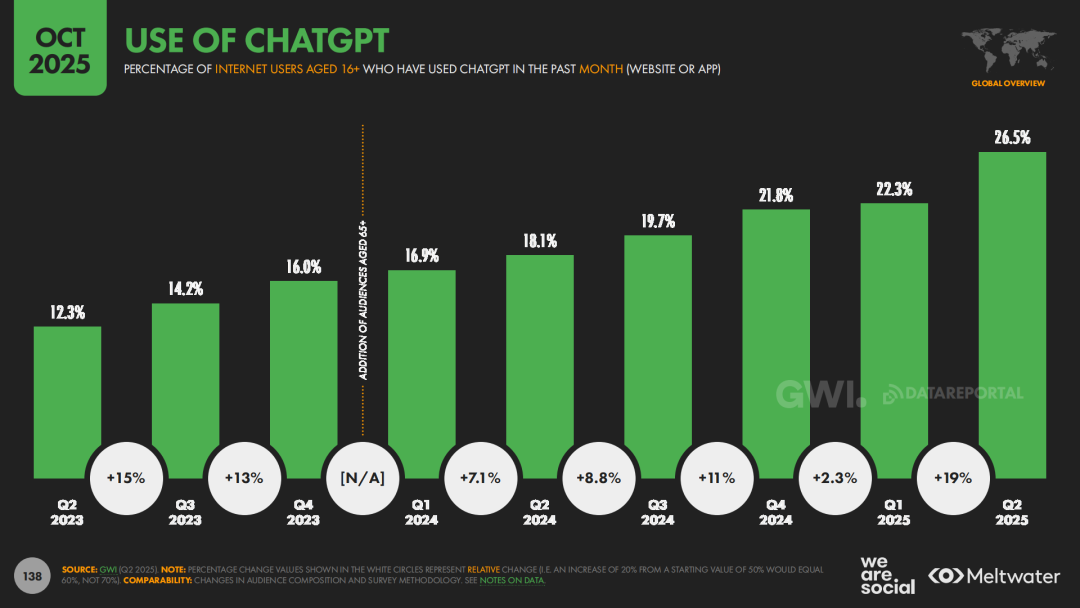 在技術層面,報告最醒目的關鍵詞無疑是人工智能,尤其是生成式AI的迅猛擴張。報告顯示,ChatGPT已成為全球增長最快的數字應用之一,使用ChatGPT的互聯網用戶占比不斷增加,生成式AI工具的月度使用人群總體規模已邁入“十億級”。更重要的是,AI使用場景正在全面滲透日常生活:從最初的寫作輔助、學習輔導,擴展到情感陪伴、生活規劃、工作決策等多個領域。AI正在從“極客工具”變成面向大眾的“數字生活助手”。
