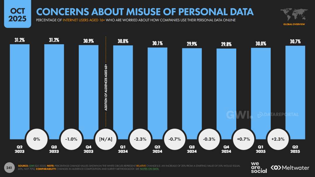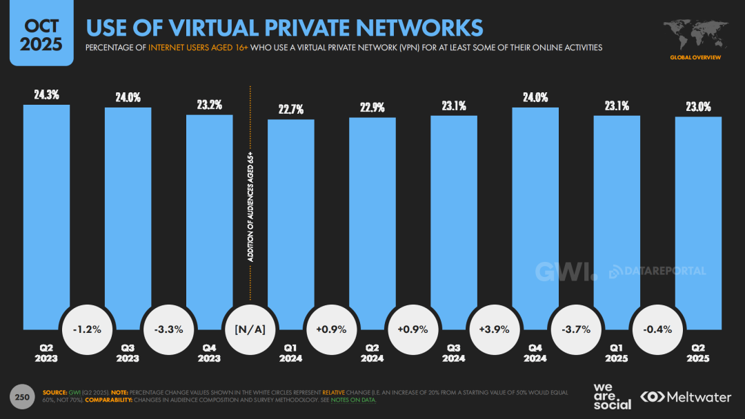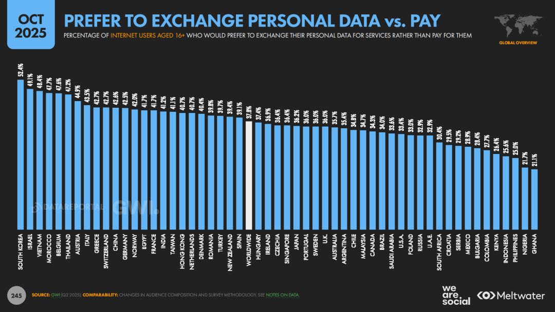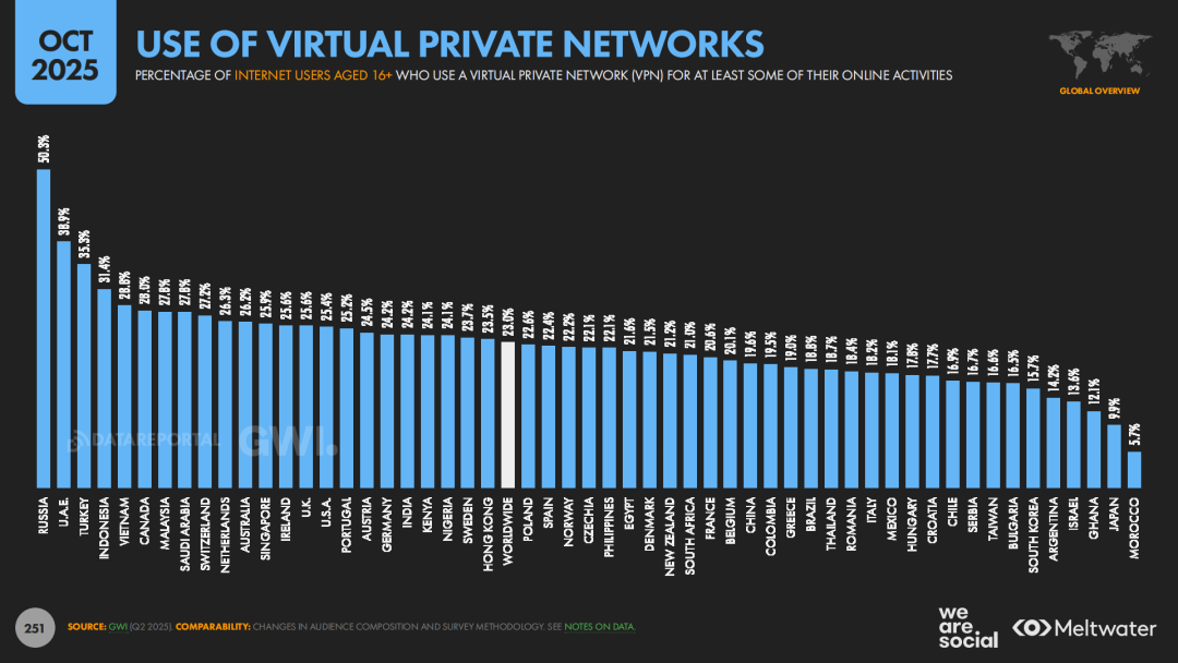 報告在隱私和數據部分呈現出一種全球共通的矛盾心態。一方面,約30.7%的用戶明確表示擔心企業濫用個人數據,“廣告太多、跟蹤太緊”是許多網民的真實感受;23%的用戶使用VPN保護隱私,在俄羅斯、阿聯酋、土耳其等國,VPN使用率尤其突出。另一方面,約37.8%的用戶愿意“用數據換服務”,這意味著可以用個人信息讓渡來能換取更順暢的體驗、更精準的推薦或更優惠的價格。
