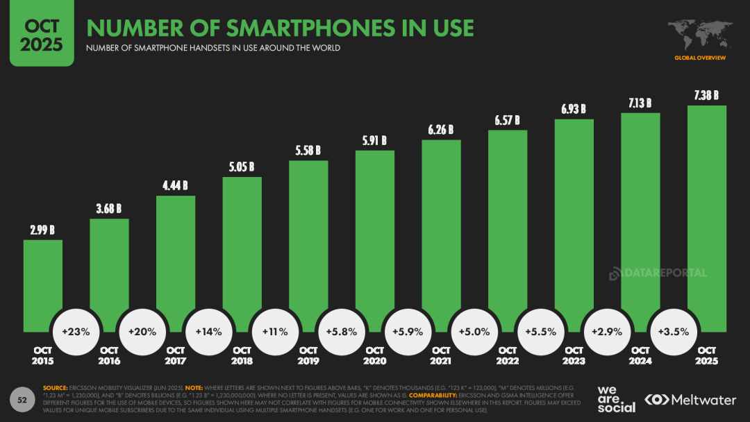 移動端已然成為主場。報告指出,全球約96%的網民通過移動設備接入互聯網,智能手機用戶約73.8億。與上一代以PC為中心的互聯網不同,這一輪數字浪潮呈現出兩個顯著特征。其一是高度移動化。在不少新興市場,用戶直接以智能手機作為接入世界的第一終端,通訊、娛樂、支付、工作幾乎都在一塊屏幕上完成。其二是高度平臺化與算法化。社交媒體、搜索引擎、內容平臺、電商平臺和數字支付彼此疊加,既構成“看得見”的前端界面,也構成“看不見”的規則系統,決定著信息如何分發、品牌如何被看見、交易如何被撮合。