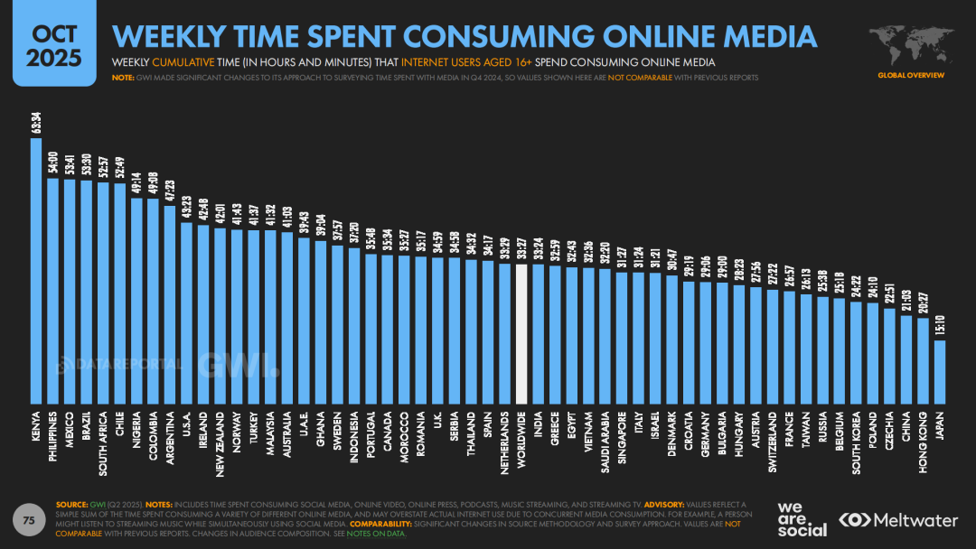 從用戶側看,互聯網使用已經從“有沒有”轉向“怎么用”。整體規模上,全球互聯網用戶增速趨緩、滲透率接近平臺期,但這并不意味著“數字化見頂”,而是意味著存量結構在重排——用戶每天依然花不少時間在線,只是這段時間被切分給了不同的平臺和場景。