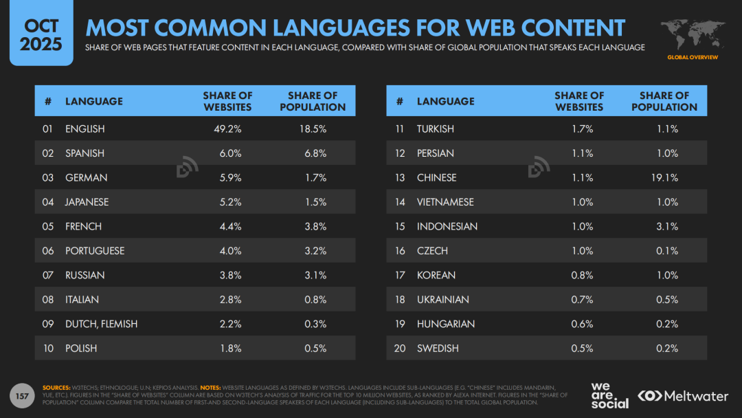 此外,報告還提醒了一個容易被忽視的維度:全球網頁近半為英文,而英語母語人口不到兩成。這意味著,在很多下沉市場,誰能更好地用當地方言講故事、用本地語境表達價值,誰就更有可能在數字營銷上占得先機。