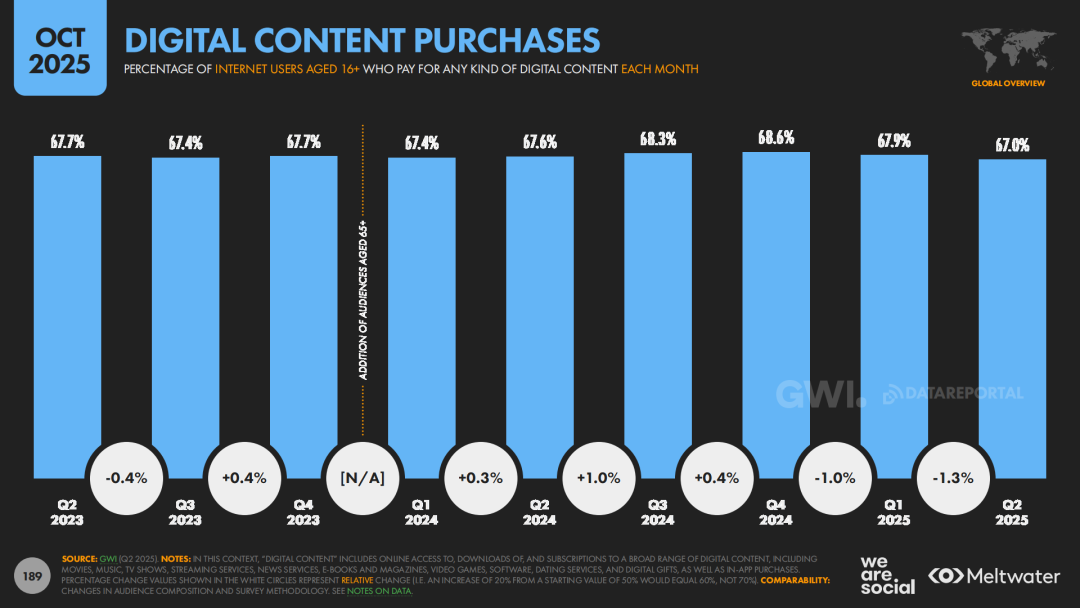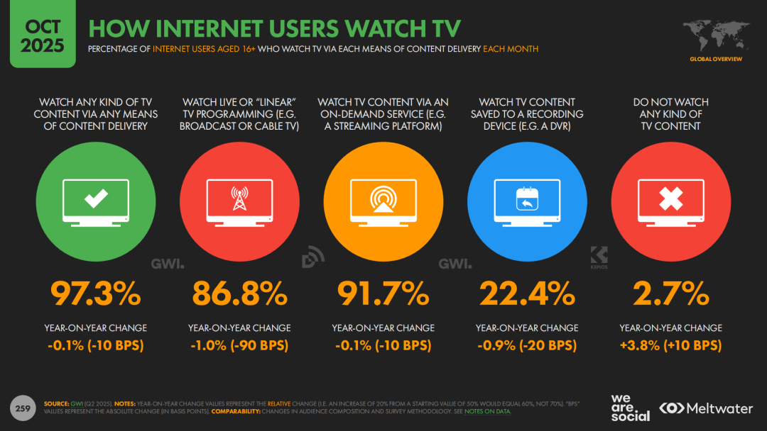 內容消費層面,流媒體與短視頻共同構成了全球注意力的“新底盤”。報告顯示,91.7%的互聯網用戶每月會觀看流媒體電視內容。同時,TikTok、Reels等短視頻平臺的觀看時長持續攀升,形成“短視頻種草”加“長視頻陪伴”的復合消費路徑。