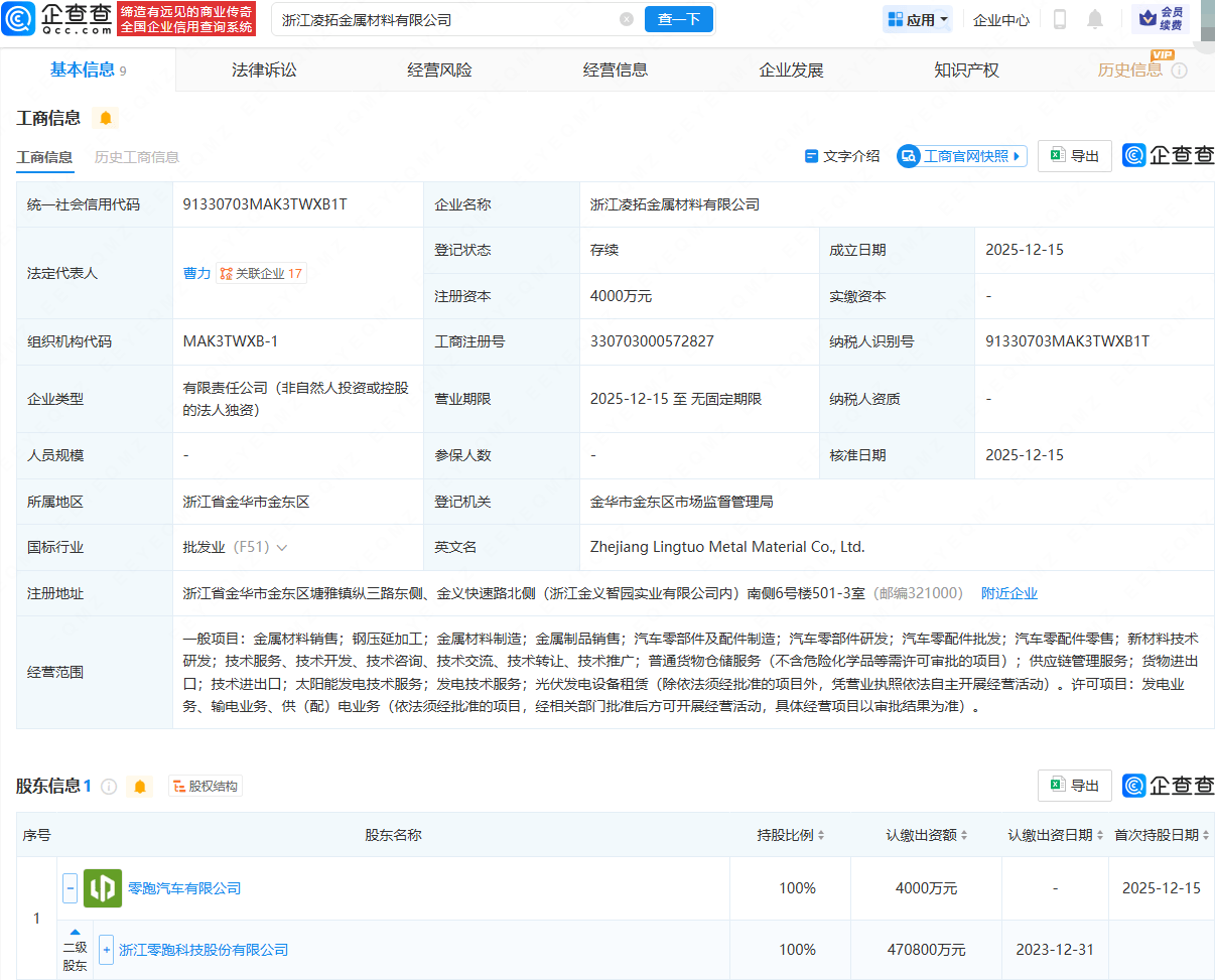 企查查APP顯示,近日,浙江凌拓金屬材料有限公司成立,法定代表人為曹力,注冊資本為4000萬元,經營范圍包含:金屬材料銷售;鋼壓延加工;金屬材料制造;金屬制品銷售;汽車零部件及配件制造;汽車零部件研發等。企查查股權穿透顯示,該公司由零跑汽車(09863.HK)旗下零跑汽車有限公司全資持股。