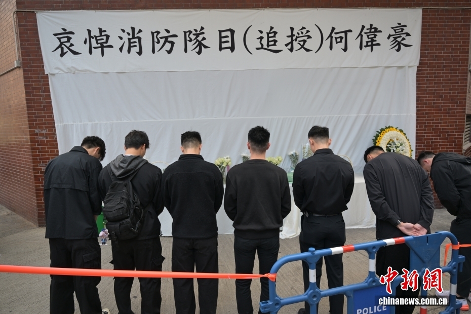 12月19日上午,香港特區政府消防處為在大埔火災中殉職的消防員何偉豪舉行最高榮譽喪禮。圖為香港市民在何偉豪生前所屬的沙田消防局外送別何偉豪。