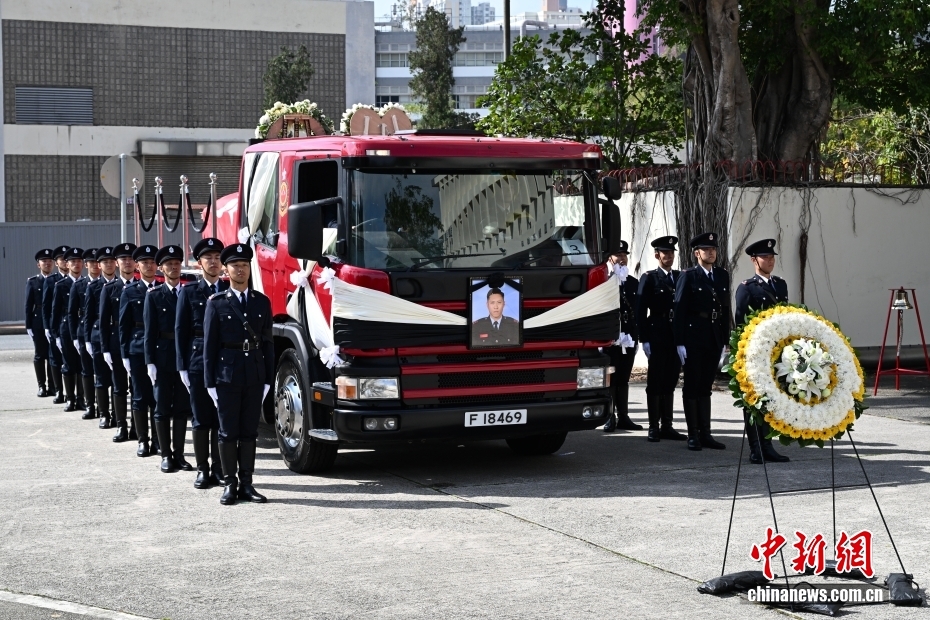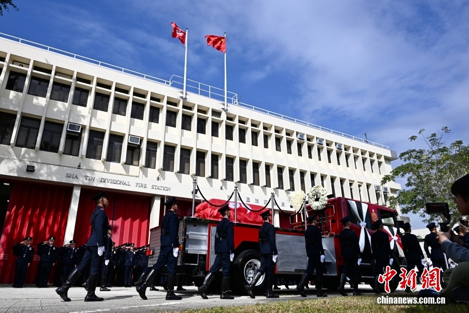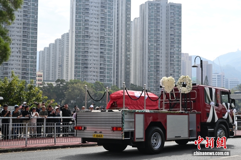 12月19日上午,香港特區政府消防處為在大埔火災中殉職的消防員何偉豪舉行最高榮譽喪禮。圖為何偉豪靈車經過其生前所屬的沙田消防局。
