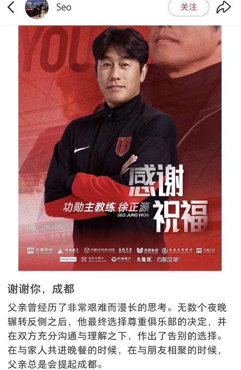 徐正源兒子在社交媒體表示,他的父親在離開之前,經過了無數個輾轉反側的夜晚,最終決定遵從俱樂部的安排。也就是說,徐正源是真的非常想留在俱樂部,也反復做了大量的權衡,甚至徹夜難眠。從他兒子的角度來說,徐正源并不是自己真的想走。