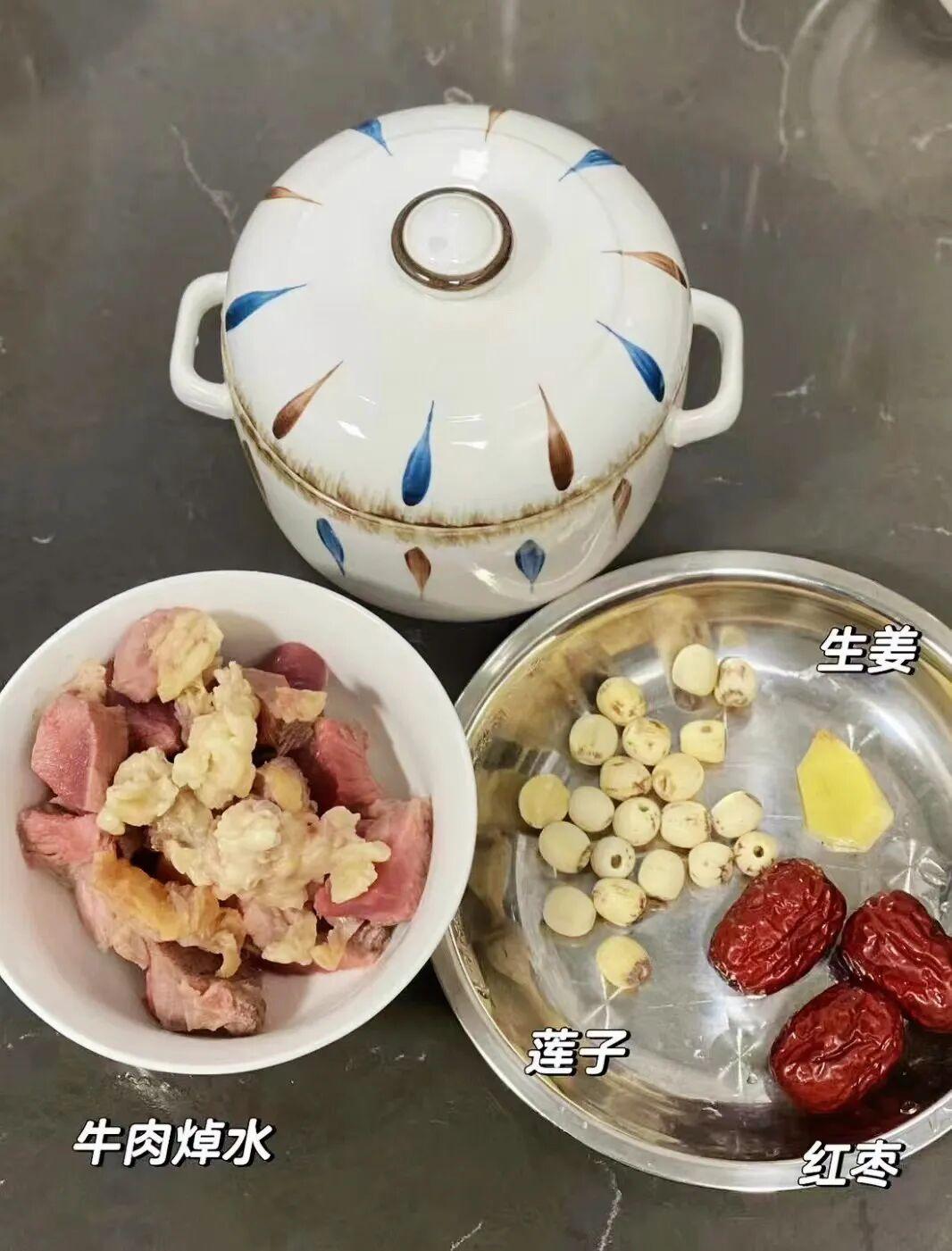 牛肉、 蓮子、紅棗、 姜片、 香蔥、鹽
