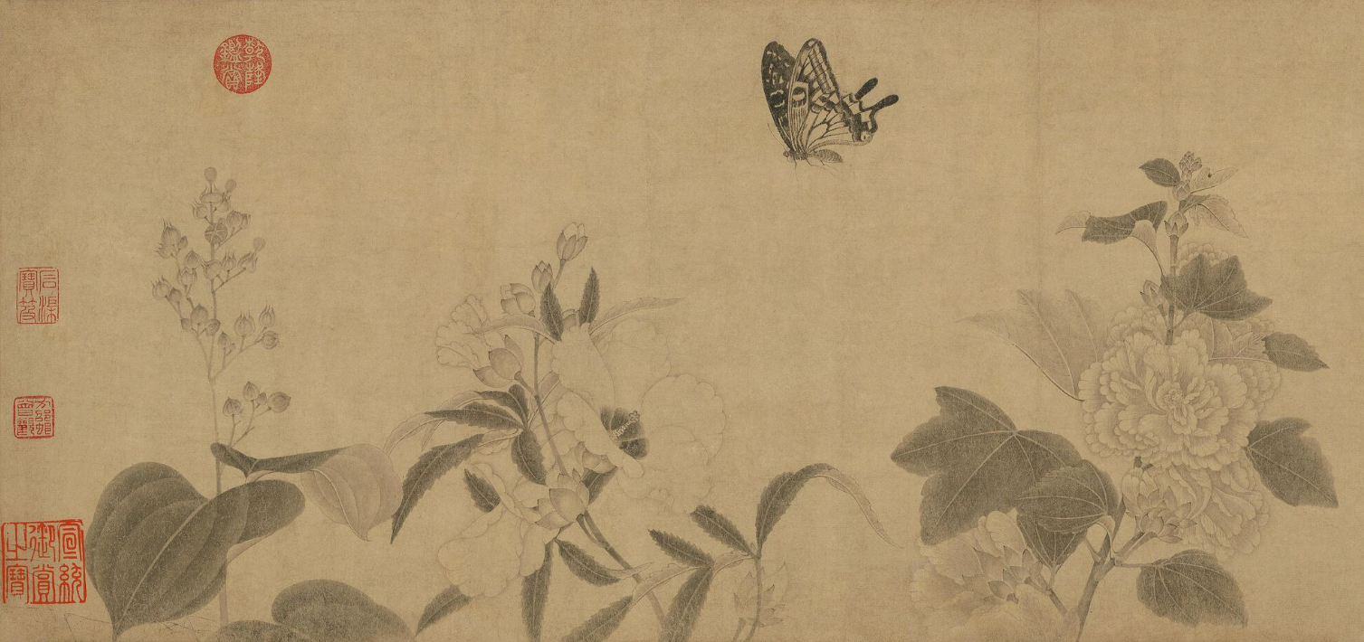 《百花圖》繪花發鳥鳴、魚躍蟲吟之態。全圖自春日的牡丹、鵲鴝至深秋的芙蓉、蜂、蝶,共繪六十余種花木與二十余種禽、鳥、蟲、魚,真實再現了自然界的無窮生機。除名花佳木外,畫中亦不乏石竹、小薊、鴨跖草等野花,與袁枚詩中名句“苔花如米小,也學牡丹開”異曲同工,體現出畫家對自然萬物的關照。此作純以水墨繪成,白描、沒骨并用。雖略顯拘謹,然其下啟元人墨韻,是水墨花鳥畫史上的重要畫作。