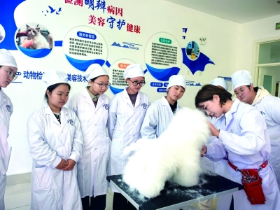 濟南護理職業學院的學生們正在學習寵物護理技巧。姚建/攝