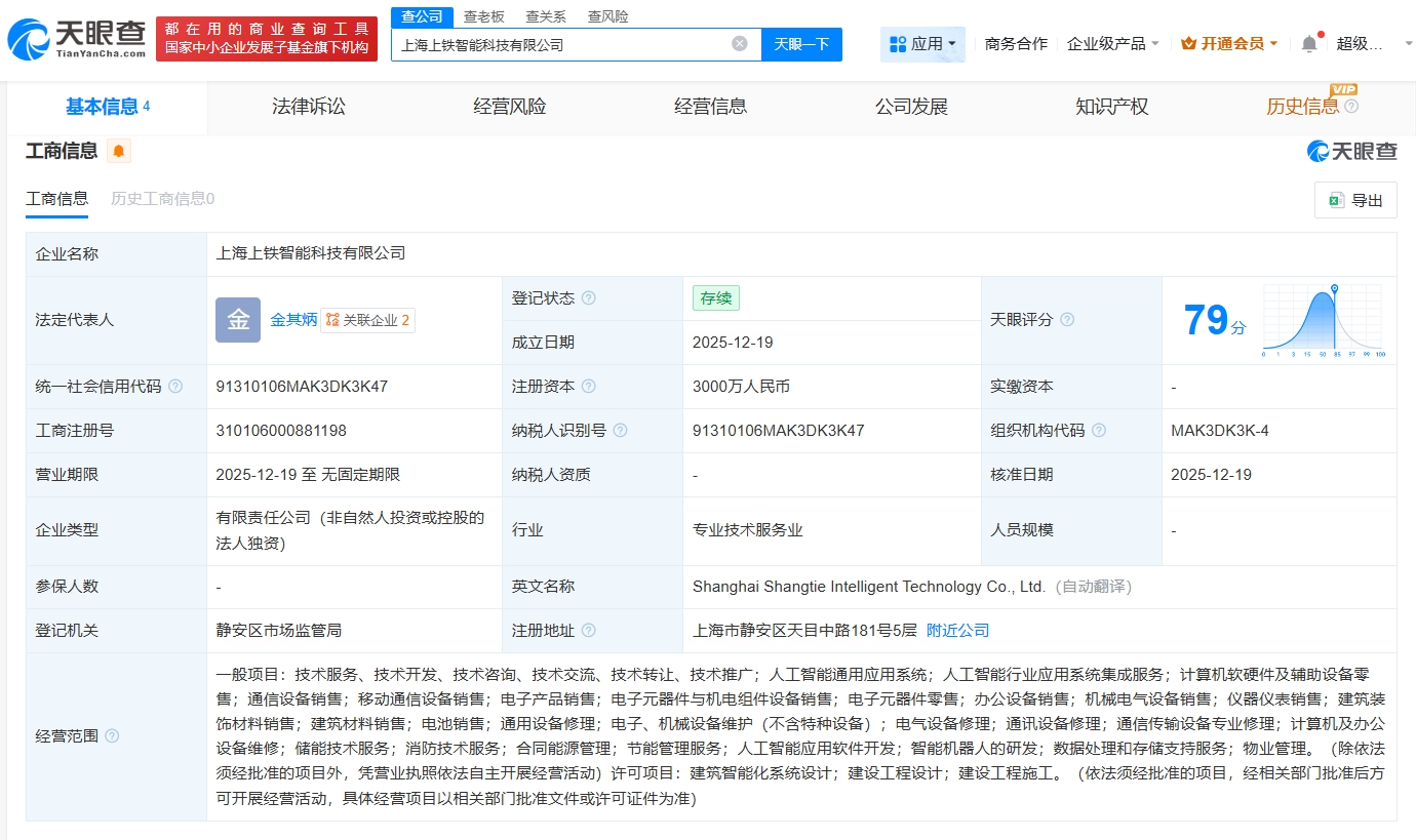 天眼查工商信息顯示,12月19日,上海上鐵智能科技有限公司成立,法定代表人為金其炳,注冊(cè)資本3000萬人民幣,經(jīng)營(yíng)范圍包括人工智能通用應(yīng)用系統(tǒng)、計(jì)算機(jī)軟硬件及輔助設(shè)備零售、儲(chǔ)能技術(shù)服務(wù)、智能機(jī)器人的研發(fā)等。股東信息顯示,該公司由中國鐵路上海…