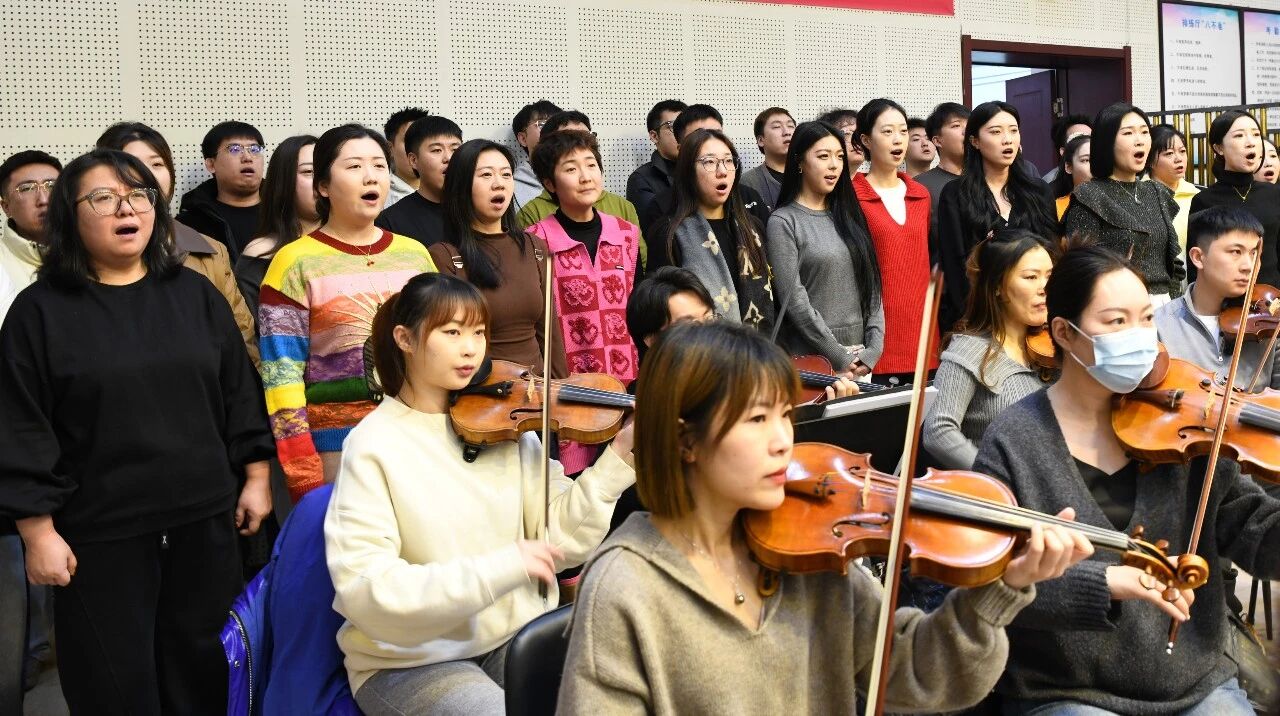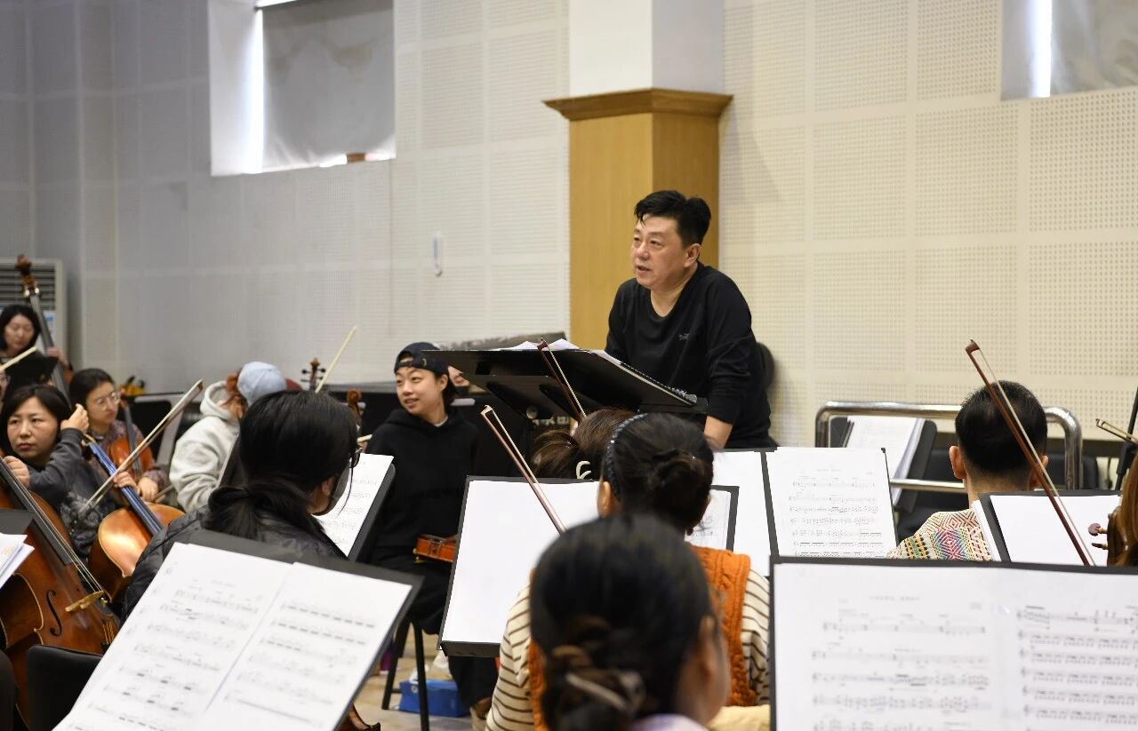 記者還未走進排練廳,激昂的旋律便先一步傳來。推開門望去,舞臺上的演職人員全員“在線”:樂手們精神飽滿,眼神緊緊鎖定指揮臺;銅管組氣勢恢宏,弦樂組細膩婉轉(zhuǎn),各個聲部配合得嚴絲合縫。