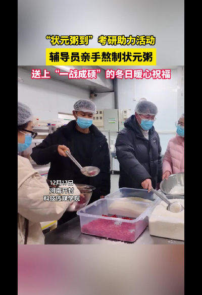 12月17日,河南開封科技傳媒學院舉辦“狀元粥到”考研助力活動,輔導員們親手熬制并為學生盛上熱騰騰的狀元粥,以暖心行動傳遞“一戰成碩”的美好祝福。