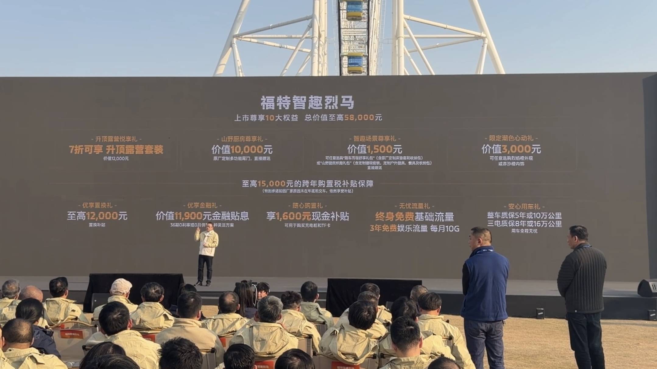 發(fā)布會(huì)現(xiàn)場(chǎng),官方還公布了至高5.8萬(wàn)元上市權(quán)益。包含露營(yíng)套裝、原廠多功能尾門、定制床墊套/收納包、炊具禮包等。