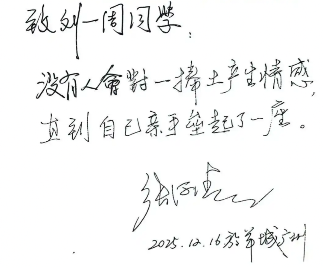 張河清手書“沒有人會對一捧土產生情感,直到自己親手壘起了一座”。(圖源:羊城晚報)