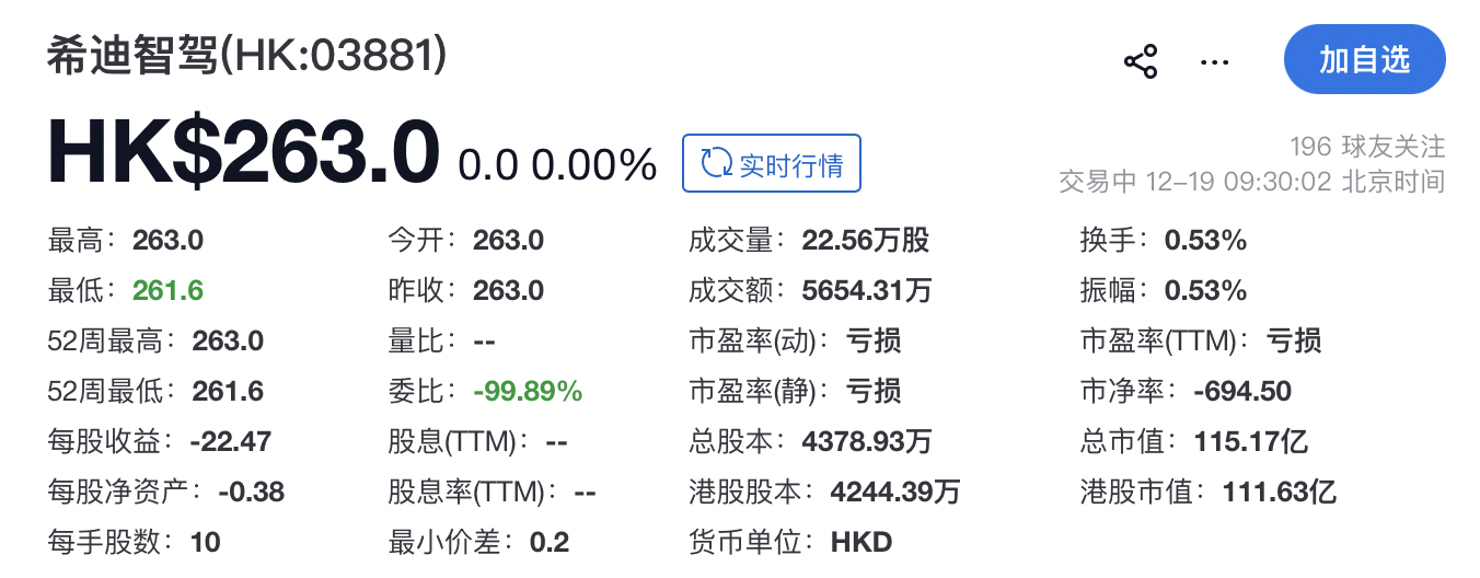 瑞財經 吳文婷 12月19日,希迪智駕(03881.HK)在港交所掛牌上市,聯席保薦人為中金公司、中信建投國際、平安證券(香港)。其股價平開報263港元,總市值約115.17億港元。