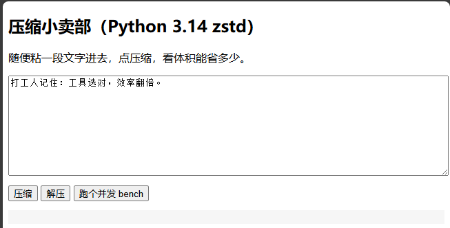 今天咱不寫論文、不擺架子,直接來個能復制就跑的入門實戰:做一個“壓縮小賣部”接口——后端用 Python 3.14 的 compression.zstd,前端一個 HTML 直接調,最后再給你補一段 鴻蒙 ArkTS 調接口的寫法。你寫完這套,回頭跟同事說一句:“這接口我十分鐘起的”,氣勢立馬不一樣。
