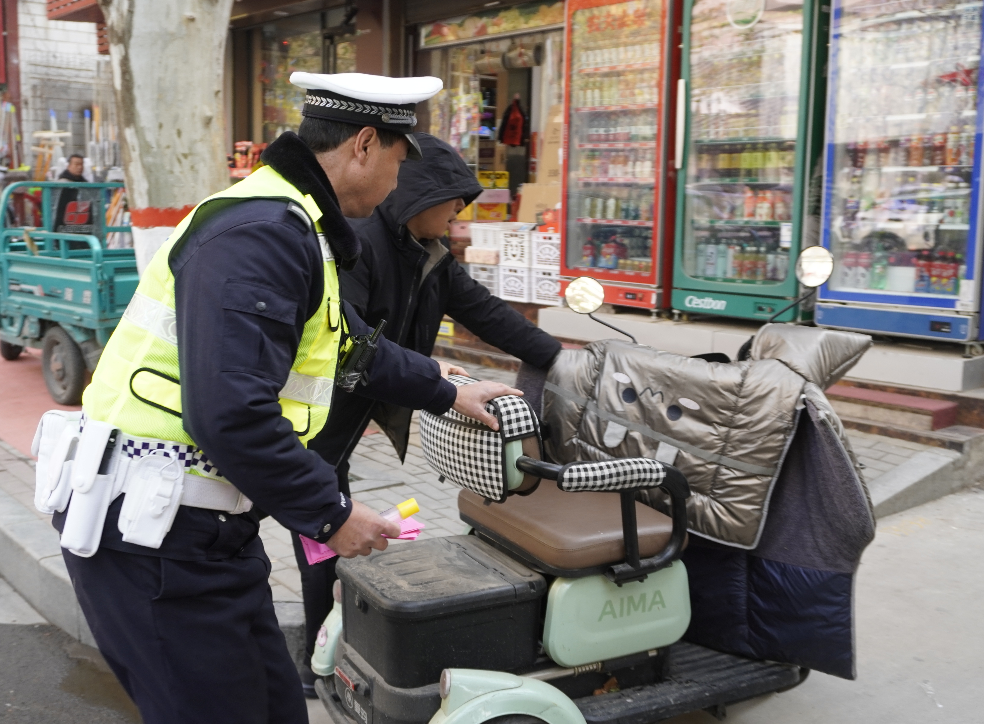 12月19日,在葉縣城區政通街,車輛往來穿梭,行人熙熙攘攘,縣公安局交通管理大隊城區中隊的交警正沿街開展常態化巡查,勸導糾正交通違法行為,守護道路通行秩序。