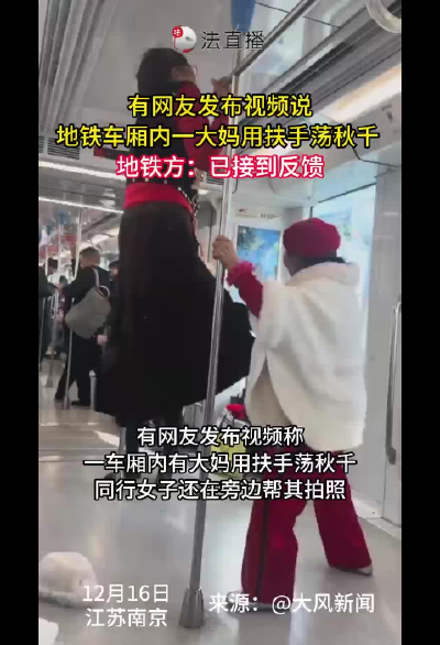 一地鐵車廂內 大媽用扶手蕩秋千 地鐵方:已接到反饋
