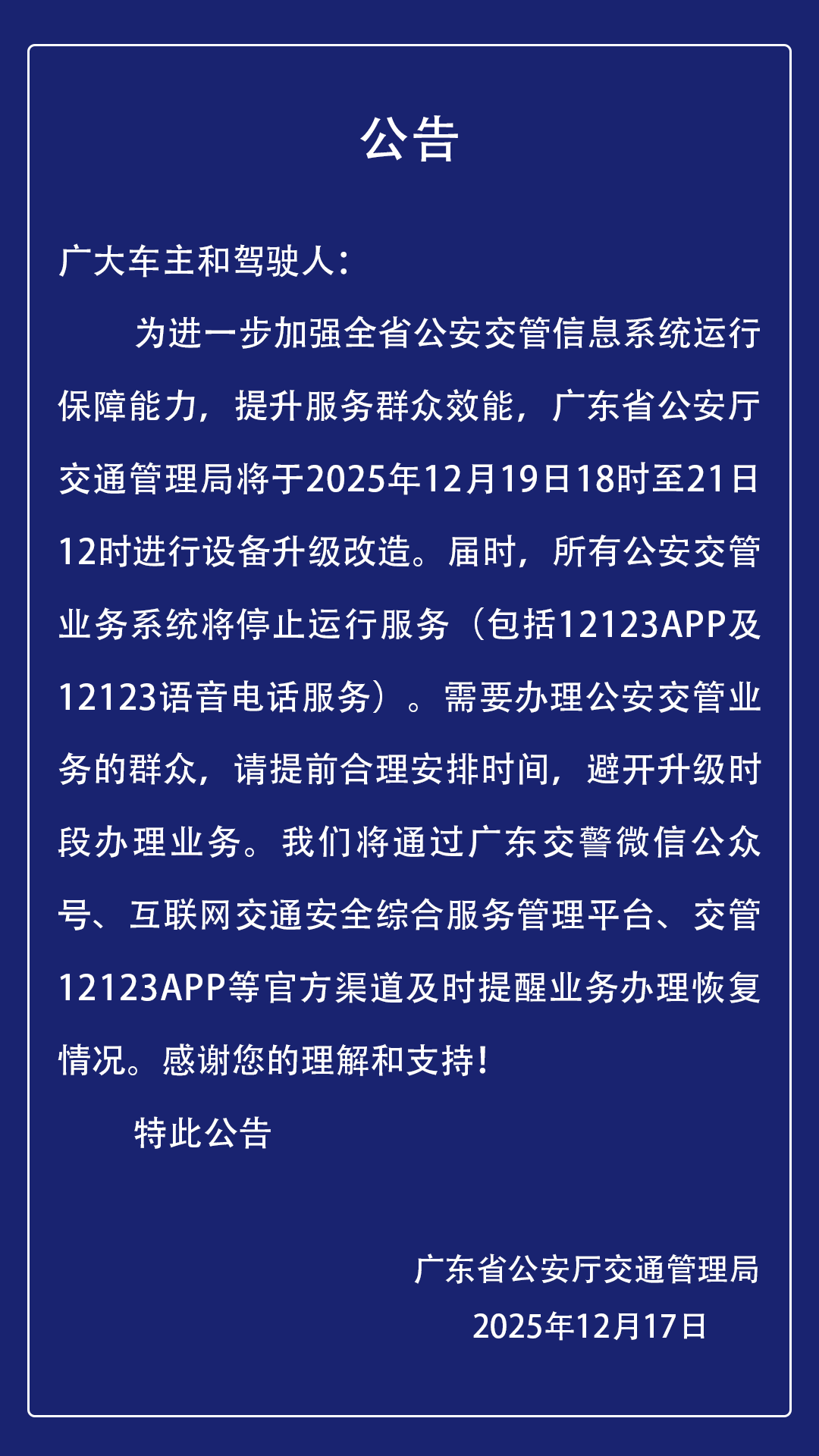 據(jù)廣東省公安廳交通管理局公告,廣東省公安廳交通管理局將于2025年12月19日18時至21日12時進(jìn)行設(shè)備升級改造。屆時,所有公安交管業(yè)務(wù)系統(tǒng)將停止運(yùn)行服務(wù)(包括12123APP及12123語音電話服務(wù))。需要辦理公安交管業(yè)務(wù)的群眾,請?zhí)崆昂侠戆才艜r間,避開升級時段辦理業(yè)務(wù)。