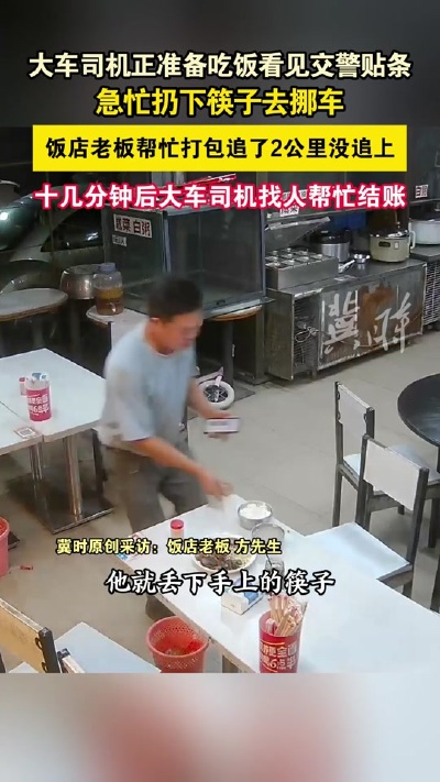 大車司機正準備吃飯看見交警貼條,急忙扔下筷子去挪車,飯店老板幫忙打包追了2公里沒追上,十幾分鐘后大車司機找人幫忙結賬