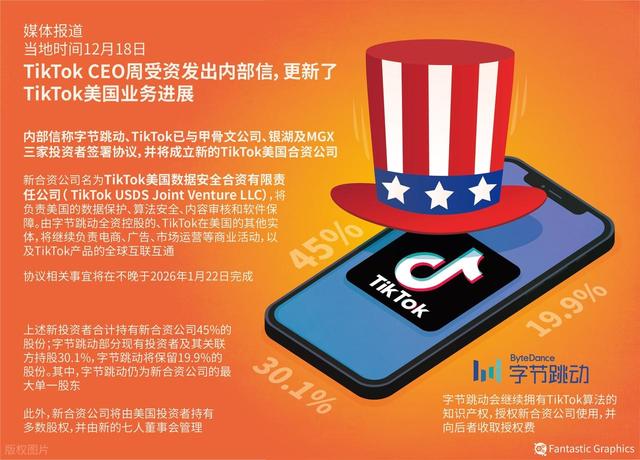 字節跳動及TikTok已與三家投資者簽署協議,將成立名為“TikTok美國數據安全合資有限責任公司”,新成立的合資公司在股權結構上,由甲骨文、銀湖及MGX三家新投資者合計持股45%,字節跳動部分現有投資者及其關聯方持股30.1%。