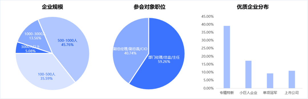 擬邀參會企業中,部門經理及以上級別占比100%,500人以上規模企業占比超60%,專精特新、小巨人、單項冠軍等優質企業占比近70%。