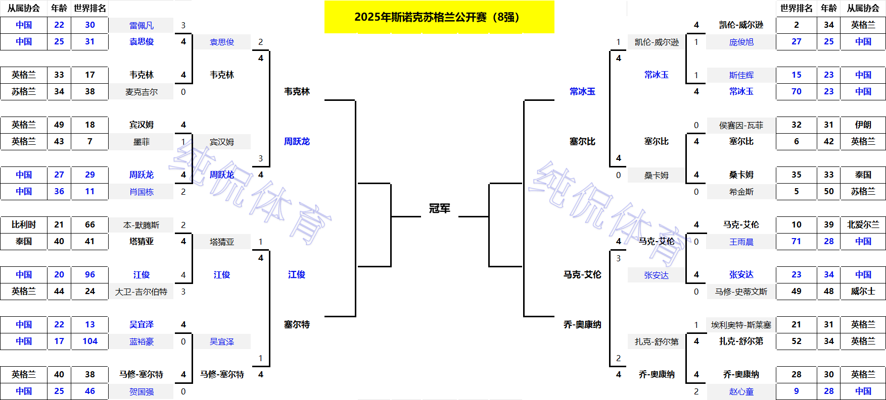 來到北京時間12月19日至20日凌晨,本屆蘇格蘭公開賽1/4決賽全面打響,3名中國球員具體對陣詳情如下: