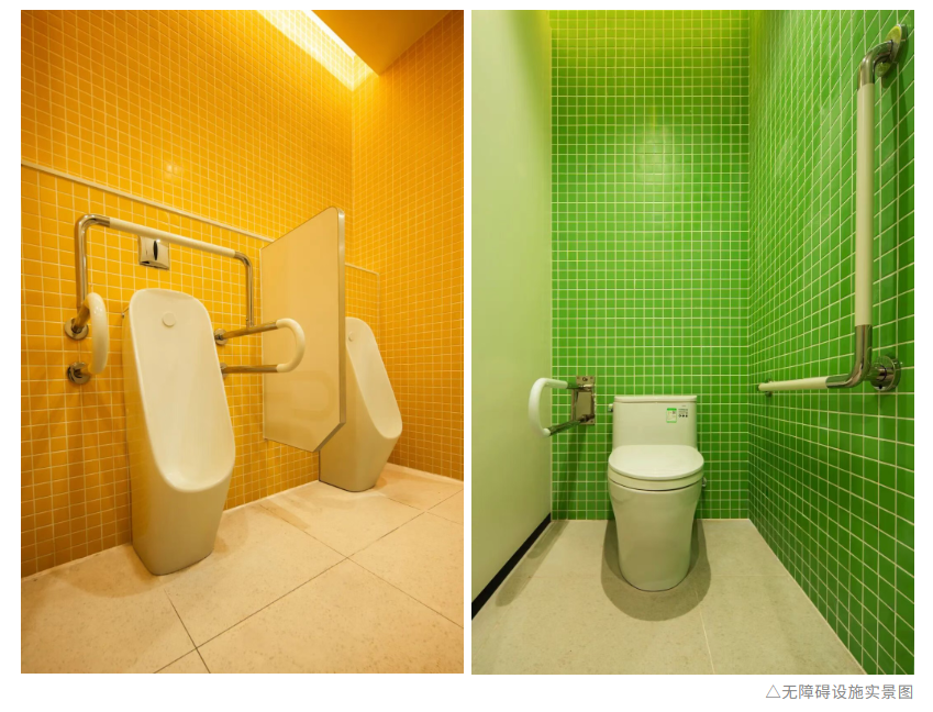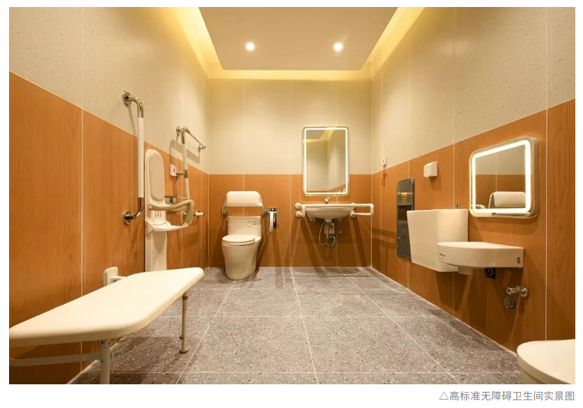 在公共衛生間配置上,30米內即可找到普通無障礙衛生間。其中,每層還設有1-2個高標準無障礙衛生間,包含成人和兒童雙坐便器、折疊床和斜面梳妝鏡,自動推拉門的設計避免了手動開關的困擾,全方位扶手為行動不便者提供安全支撐。