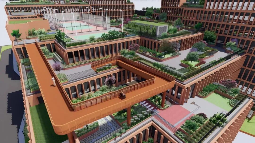 殘障朋友們可通過坡道來到屋頂的康復花園。在這個多感官一體的場景里,水石缽的跌水聲、定時播放的舒緩音樂、可觸摸的療愈植物,共同營造出平復情緒的專屬空間;運動康體花園中,網球場、門球場平整無高差,溫潤的雙層木制扶手與休息座椅按需布置,無論是日常鍛煉還是好友小聚,使用者都能在此找到舒適的角落。