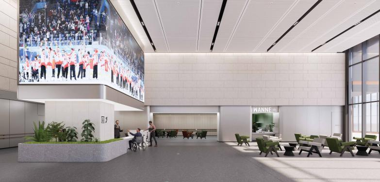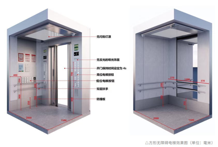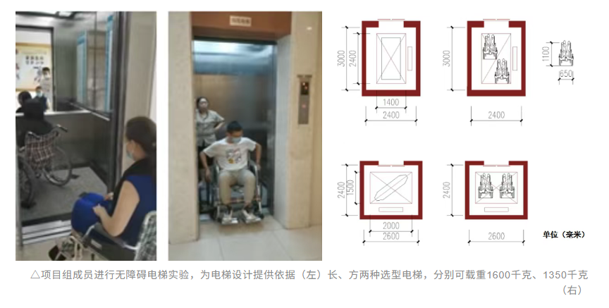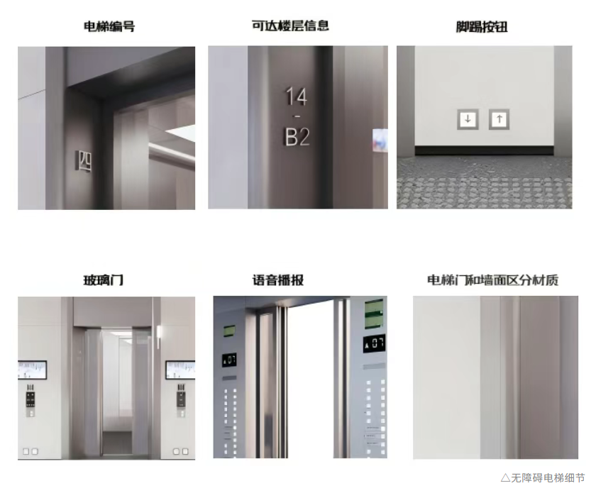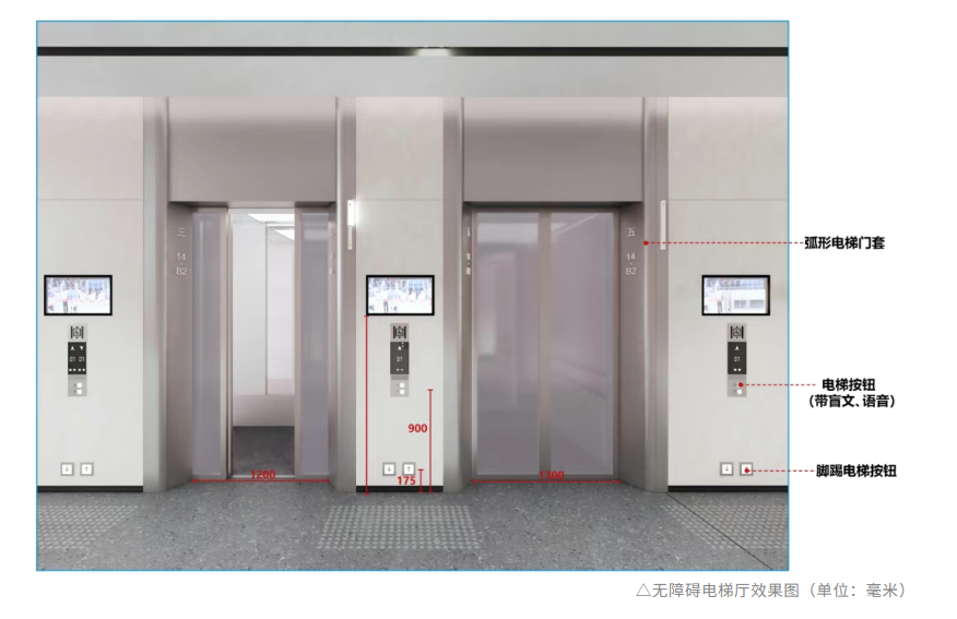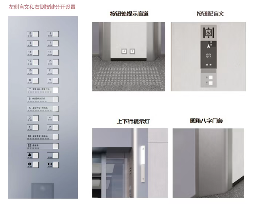 進入室內,27部無障礙電梯合理分布在建筑內部,其數量及運載能力接近常規建筑兩倍,實現了無礙的豎向貫通——室內盲道直接通向電梯按鈕區,長、方兩種選型的電梯均至少可容納一個擔架或兩個輪椅,方便輪椅回轉;轎廂內設有高低位按鈕、腳踢控制鍵,其中高位按鍵的盲文與按鍵分左右兩側設置,有效防止誤觸;語音播報和加長開門等候時間,為視力障礙者提供便捷操作體驗。