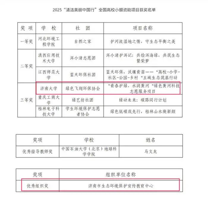 近日,生態環境部正式揭曉2025“清潔美麗中國行”全國高校小額資助項目獲獎名單,其中,濟南大學綠色飛翔環保協會“青春護綠水潤黃河”綠色黃河科技志愿服務項目成功入選2025“清潔美麗中國行”全國高校小額資助項目獲獎名單,濟南市生態環境保護宣傳教育中心獲評“優秀組織獎”。