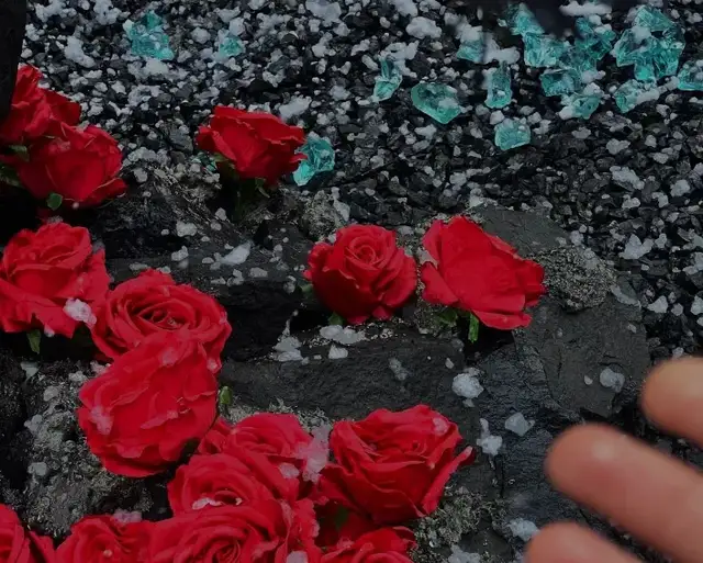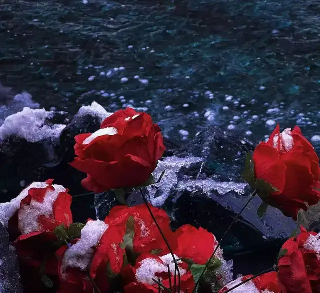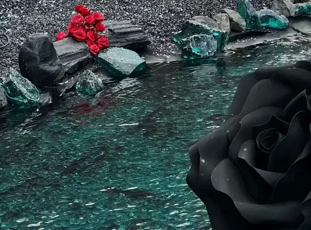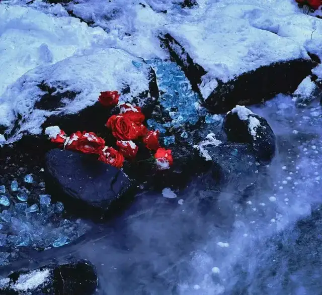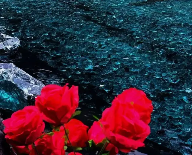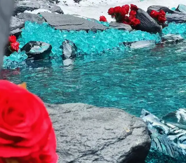 而一旁的“藍色多瑙河”更是將這份浪漫推到極致,澄澈的藍綠色水面映著黑紅玫瑰的影子,剔透的藍石塊散落在水岸。俯身蹲下,身體微微向水面傾斜,低頭看向水面,拍出清冷破碎感。