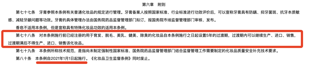 根據2021年1月1日起施行的《化妝品監督管理條例》(以下簡稱《條例》)第七十八條,對本條例施行前已經注冊的用于育發、脫毛、美乳、健美、除臭的化妝品自本條例施行之日起設置5年的過渡期,過渡期內可以繼續生產、進口、銷售,過渡期滿后不得生產、進口、銷售該化妝品。