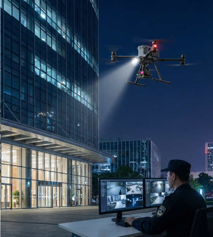自動巡更:無人機按預設航線實現(xiàn)無人化全域巡航,覆蓋人力盲區(qū)(廣場、周界、屋頂),有效降低安全盲區(qū)覆蓋率。