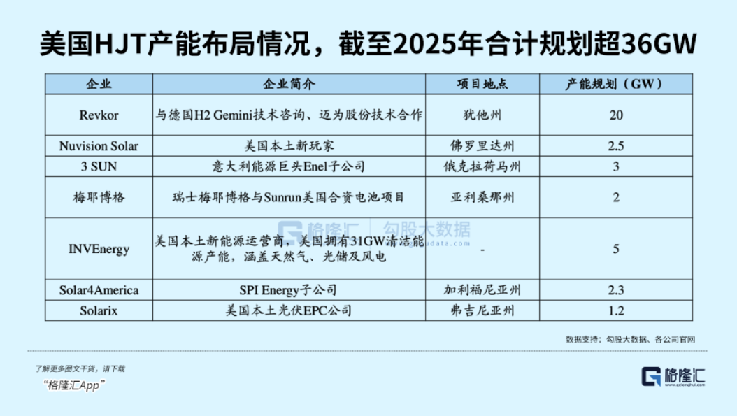 同時,市場對HJT技術(shù)的認(rèn)可已轉(zhuǎn)化為實質(zhì)性的產(chǎn)能規(guī)劃。自2024年以來,美國多家企業(yè)陸續(xù)宣布HJT產(chǎn)能擴建計劃。截至2025年底,美國已有六七家企業(yè)明確HJT產(chǎn)能規(guī)劃,總計規(guī)模超30GW,這一波產(chǎn)能擴張將在2026-2028年集中落地,為產(chǎn)業(yè)鏈上下游帶來確定性機會。